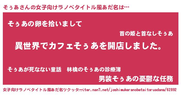 そぅあさんの女子向けラノベタイトル風あだ名は… 『異世界でカフェそぅあを開店しました。』『そぅあの卵を拾いまして』『男装そぅあの憂鬱な任務』 ツクッター #女子向けラノベタイトル風あだ名ツクッター http://tkutter.nan7.net/joshimukeranobetaitoruadana/62892/