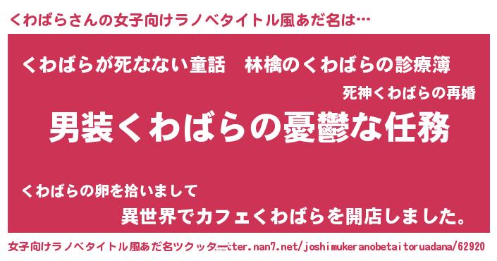 | 男性向けラノベタイトル風あだ名 | 『うちのくわばらが世界を掌握している!』 |