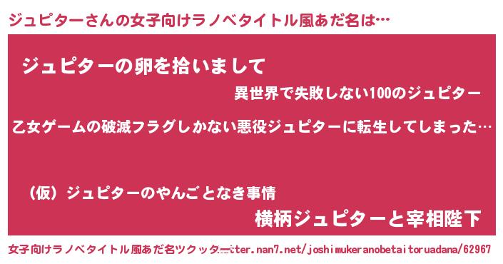 | 男性向けラノベタイトル風あだ名 | 『この素晴らしい世界にジュピターを!』 |