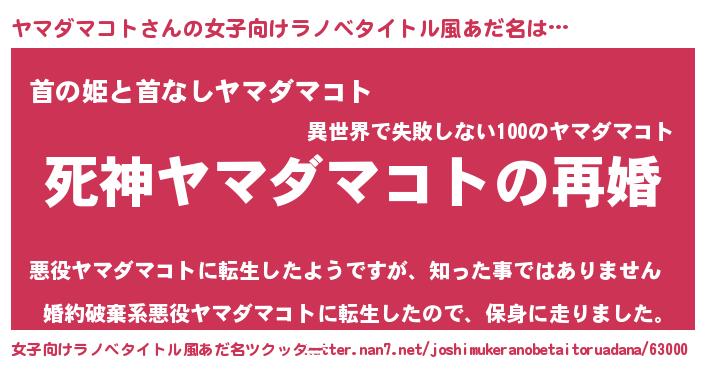 ヤマダマコトさんの女子向けラノベタイトル風あだ名は… 『死神ヤマダマコトの再婚』『首の姫と首なしヤマダマコト』『婚約破棄系悪役ヤマダマコトに転生したので、保身に走りました。』 ツクッター #女子向けラノベタイトル風あだ名ツクッター http://tkutter.nan7.net/joshimukeranobetaitoruadana/63000/