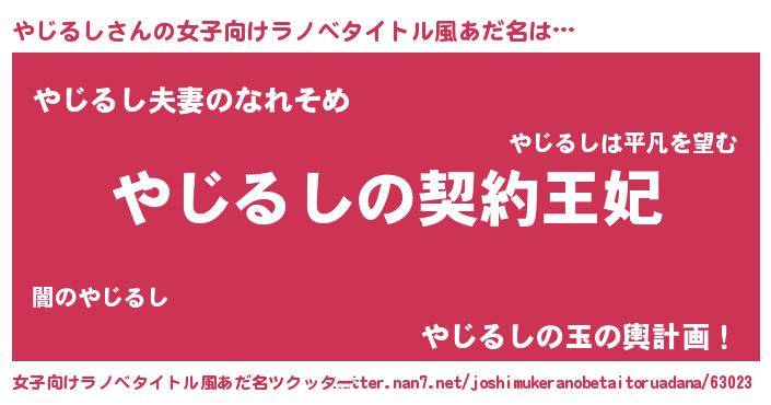 やじるしさんの女子向けラノベタイトル風あだ名は… 『やじるしの契約王妃』『やじるし夫妻のなれそめ』『やじるしの玉の輿計画!』 ツクッター #女子向けラノベタイトル風あだ名ツクッター http://tkutter.nan7.net/joshimukeranobetaitoruadana/63023/