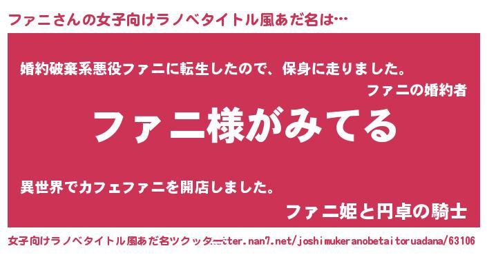 | 男性向けラノベタイトル風あだ名 | 『ファニの嫁は女の子じゃないと思った?』 |