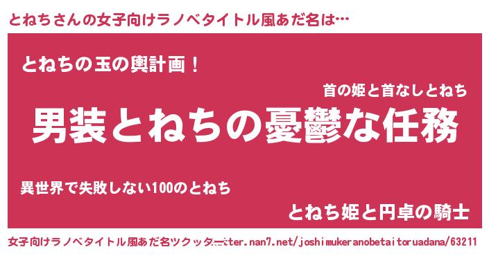 | 男性向けラノベタイトル風あだ名 | 『冴えないとねちの育てかた』 |