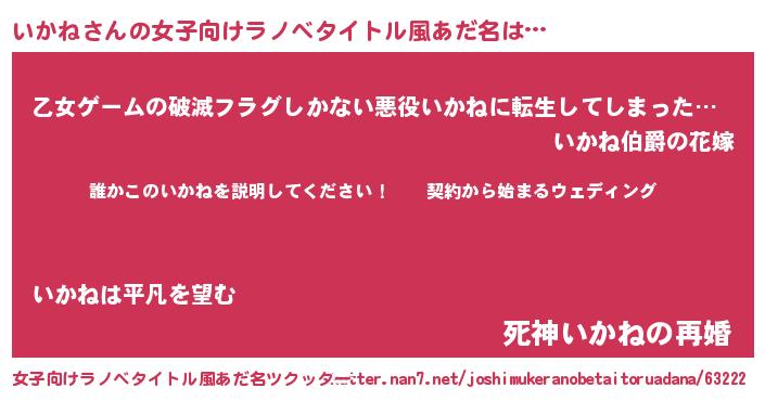 いかねさんの女子向けラノベタイトル風あだ名は… 『誰かこのいかねを説明してください! ~契約から始まるウェディング~』『乙女ゲームの破滅フラグしかない悪役いかねに転生してしまった…』『死神いかねの再婚』 ツクッター #女子向けラノベタイトル風あだ名ツクッター http://tkutter.nan7.net/joshimukeranobetaitoruadana/63222/