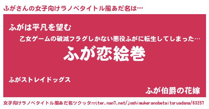 ふがさんの女子向けラノベタイトル風あだ名は… 『ふが恋絵巻』『ふがは平凡を望む』『ふが伯爵の花嫁』 ツクッター #女子向けラノベタイトル風あだ名ツクッター http://tkutter.nan7.net/joshimukeranobetaitoruadana/63257/