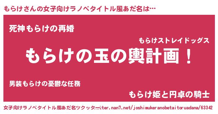 | 男性向けラノベタイトル風あだ名 | 『もらけ~年齢イコール彼女いない歴の魔法使い~』 |