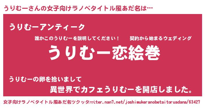 | 男性向けラノベタイトル風あだ名 | 『おまえをオタクにしてやるから、俺をうりむーにしてくれ! 』 |