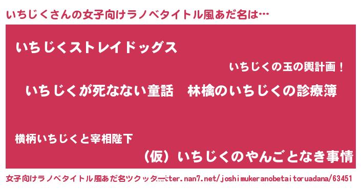 いちじくさんの女子向けラノベタイトル風あだ名は… 『いちじくが死なない童話 林檎のいちじくの診療簿』『いちじくストレイドッグス』『(仮)いちじくのやんごとなき事情』 ツクッター #女子向けラノベタイトル風あだ名ツクッター http://tkutter.nan7.net/joshimukeranobetaitoruadana/63451/