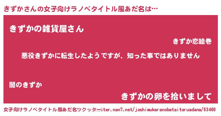| 男性向けラノベタイトル風あだ名 | 『この素晴らしい世界にきずかを!』 |