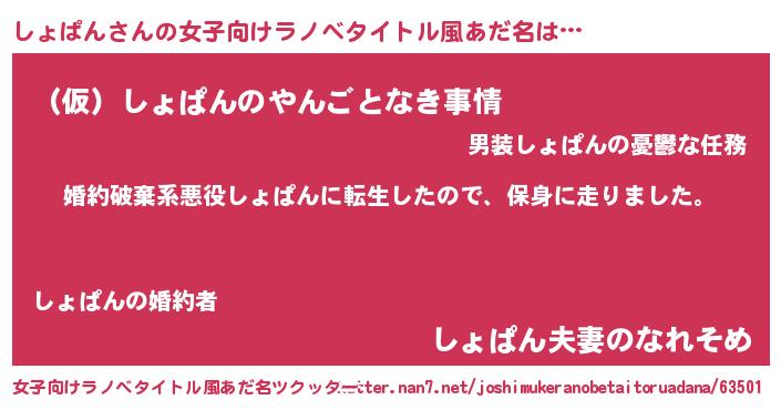 | 男性向けラノベタイトル風あだ名 | 『転生したらしょぱんだった件』 |