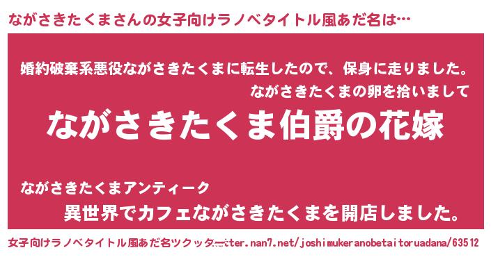 | 男性向けラノベタイトル風あだ名 | 『やはりながさきたくまの青春ラブコメはまちがっている 』 |