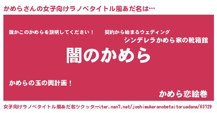 | 男性向けラノベタイトル風あだ名 | 『Re:かめらから始める異世界生活』 |