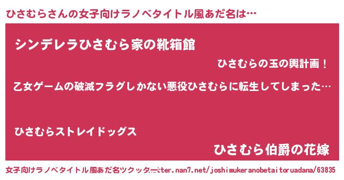 | 男性向けラノベタイトル風あだ名 | 『この素晴らしい世界にひさむらを!』 |