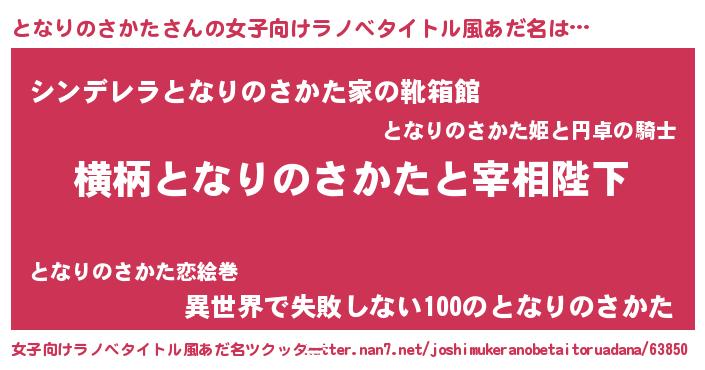 | 男性向けラノベタイトル風あだ名 | 『となりのさかたに滅ぼされるだけの簡単なお仕事です』 |