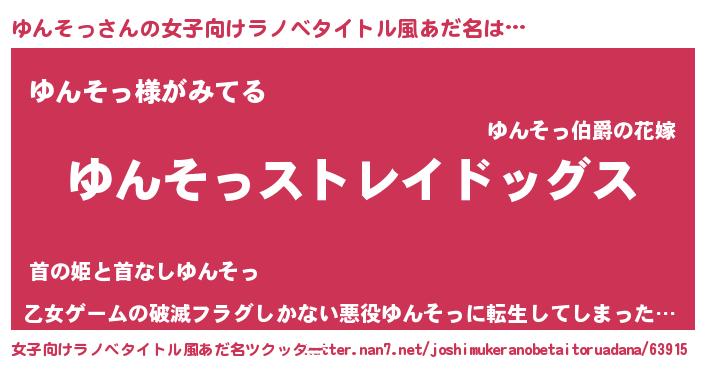 | 男性向けラノベタイトル風あだ名 | 『Re:ゆんそっから始める異世界生活』 |