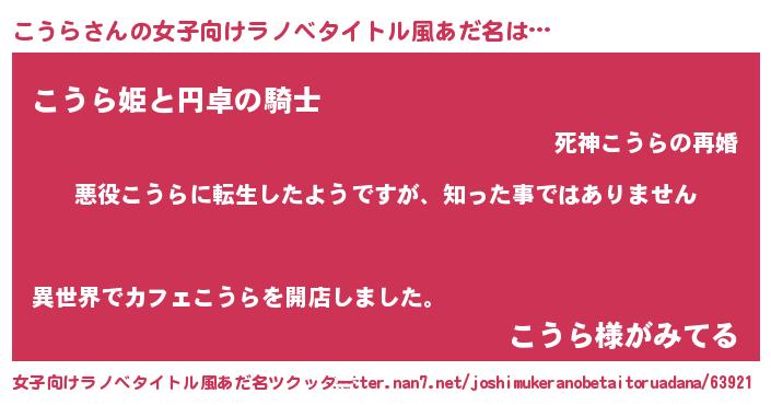 | 男性向けラノベタイトル風あだ名 | 『この素晴らしい世界にこうらを!』 |