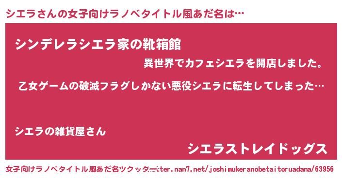| 男性向けラノベタイトル風あだ名 | 『この素晴らしい世界にシエラを!』 |