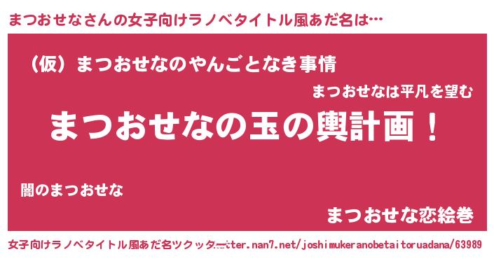 | 男性向けラノベタイトル風あだ名 | 『まつおせな~年齢イコール彼女いない歴の魔法使い~』 |