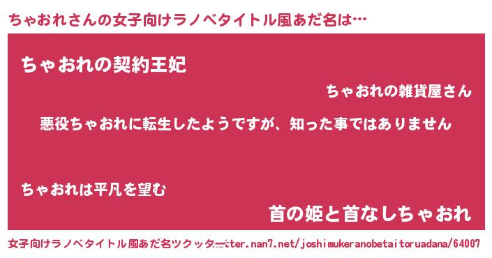 | 男性向けラノベタイトル風あだ名 | 『この素晴らしい世界にちゃおれを!』 |