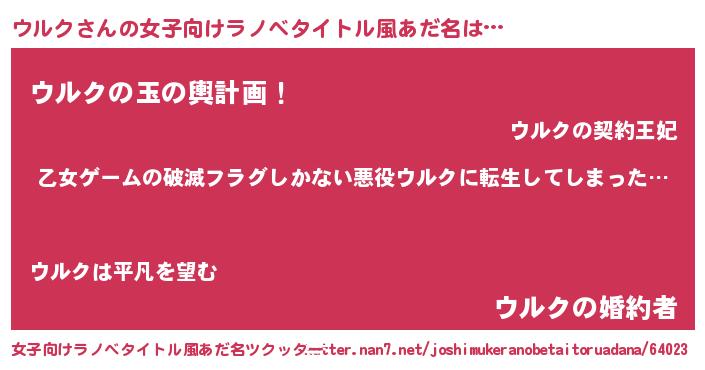 | 男性向けラノベタイトル風あだ名 | 『この素晴らしい世界にウルクを!』 |