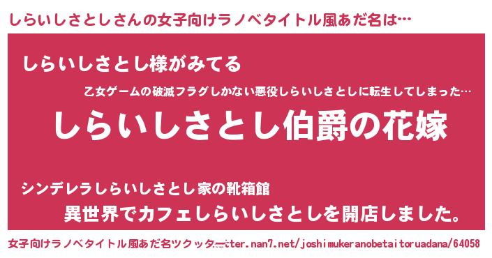 | 男性向けラノベタイトル風あだ名 | 『うちの娘の為ならば、俺はもしかしたらしらいしさとしも倒せるかもしれない。』 |