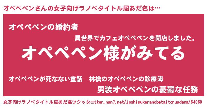 | 男性向けラノベタイトル風あだ名 | 『オペペペンの嫁は女の子じゃないと思った?』 |