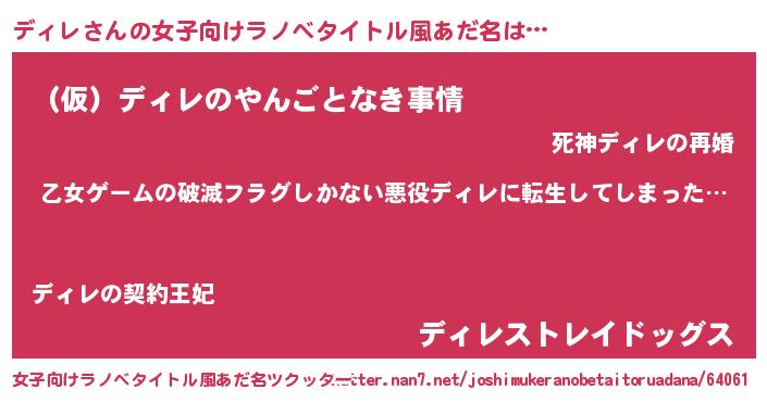 | 男性向けラノベタイトル風あだ名 | 『この素晴らしい世界にディレを!』 |