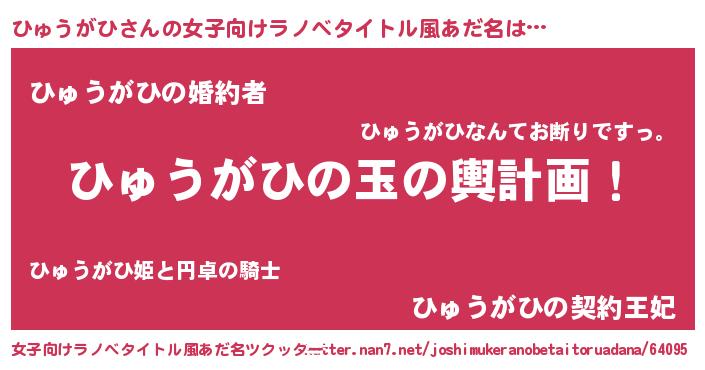 | 男性向けラノベタイトル風あだ名 | 『ひゅうがひ~年齢イコール彼女いない歴の魔法使い~』 |