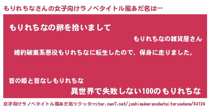 | 胡散臭い通販商品みたいなあだ名 | 『信頼と実績のネックレス…その名も「もりれちな」』 |