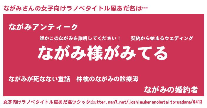 | 男性向けラノベタイトル風あだ名 | 『ながみの嫁は女の子じゃないと思った?』 |
