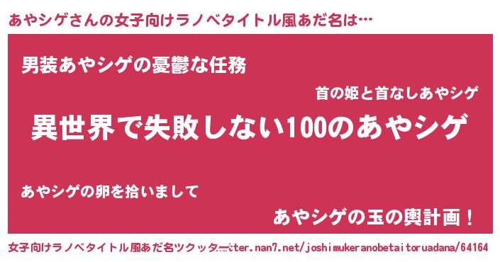 | 男性向けラノベタイトル風あだ名 | 『あやシゲという概念が存在しない退屈な世界 』 |