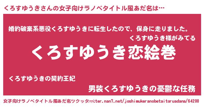 | 男性向けラノベタイトル風あだ名 | 『おまえをオタクにしてやるから、俺をくろすゆうきにしてくれ! 』 |