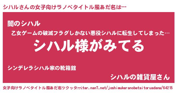 | 男性向けラノベタイトル風あだ名 | 『シハルの嫁は女の子じゃないと思った?』 |