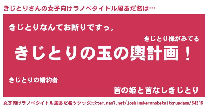 | 男性向けラノベタイトル風あだ名 | 『きじとり~年齢イコール彼女いない歴の魔法使い~』 |