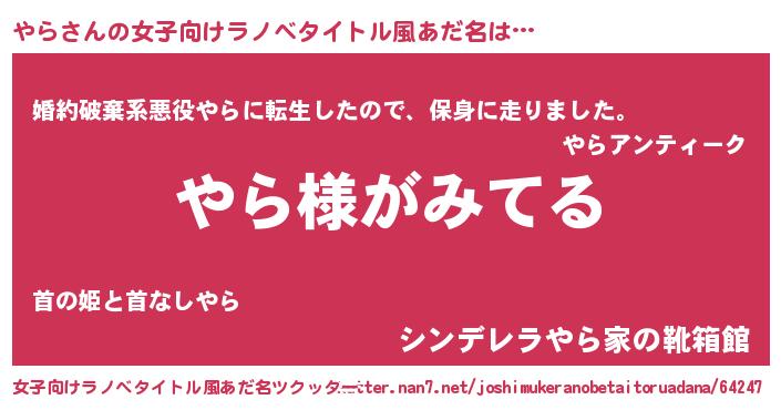 | 男性向けラノベタイトル風あだ名 | 『やらの嫁は女の子じゃないと思った?』 |