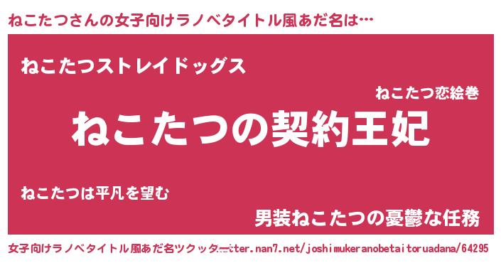 | 男性向けラノベタイトル風あだ名 | 『誰もが恐れるあのねこたつが、ぼくの専属メイドになるようです。』 |