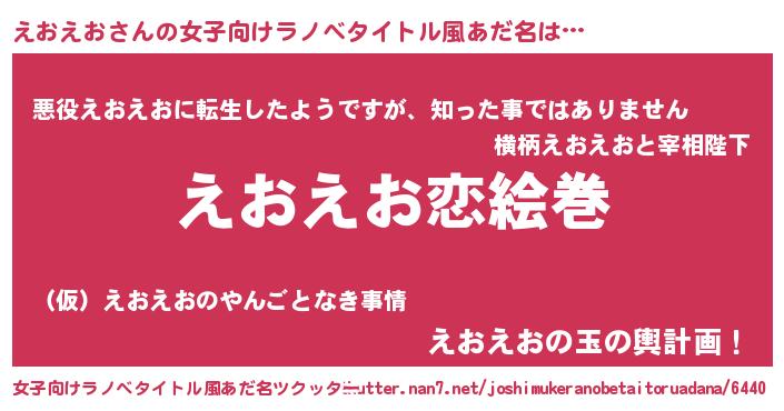 | 男性向けラノベタイトル風あだ名 | 『おまえをオタクにしてやるから、俺をえおえおにしてくれ! 』 |