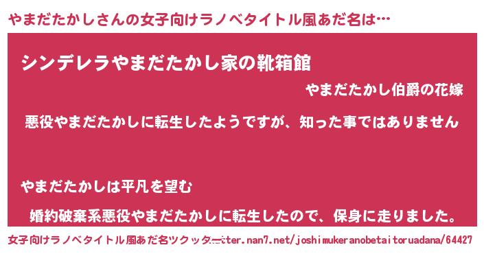 | 男性向けラノベタイトル風あだ名 | 『この素晴らしい世界にやまだたかしを!』 |