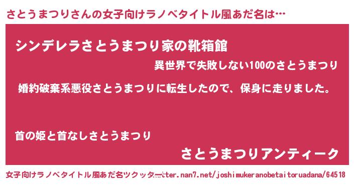 | 男性向けラノベタイトル風あだ名 | 『転生したらさとうまつりだった件』 |