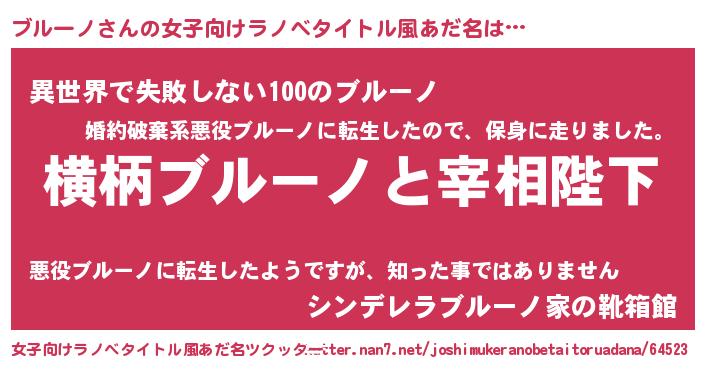 | 男性向けラノベタイトル風あだ名 | 『ブルーノに滅ぼされるだけの簡単なお仕事です』 |