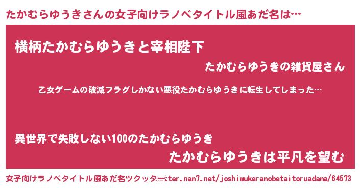 | 男性向けラノベタイトル風あだ名 | 『この素晴らしい世界にたかむらゆうきを!』 |