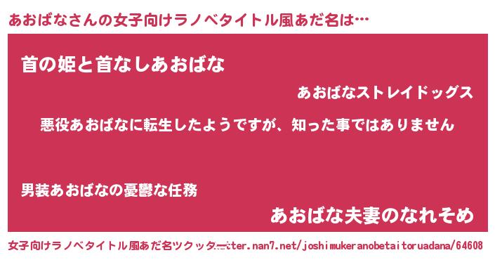 | 男性向けラノベタイトル風あだ名 | 『この素晴らしい世界にあおばなを!』 |