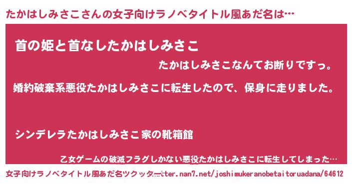 | 男性向けラノベタイトル風あだ名 | 『タカハシミサコスレイヤー』 |