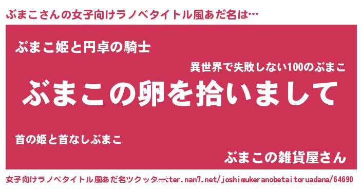 | 男性向けラノベタイトル風あだ名 | 『ぶまこの嫁は女の子じゃないと思った?』 |