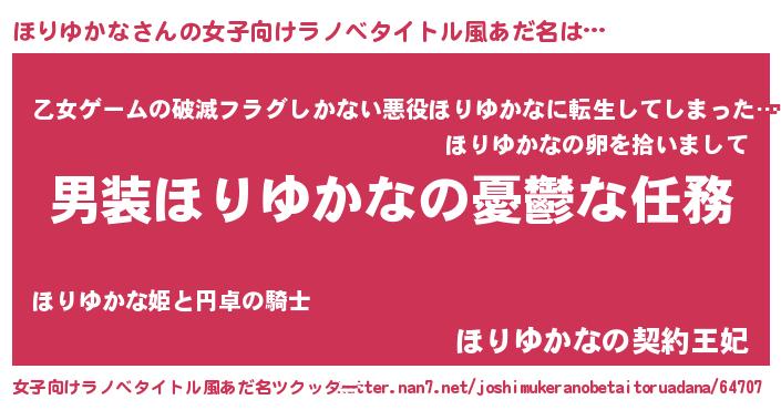 ほりゆかなさんの女子向けラノベタイトル風あだ名は… 『男装ほりゆかなの憂鬱な任務』『乙女ゲームの破滅フラグしかない悪役ほりゆかなに転生してしまった…』『ほりゆかなの契約王妃』 ツクッター #女子向けラノベタイトル風あだ名ツクッター http://tkutter.nan7.net/joshimukeranobetaitoruadana/64707/