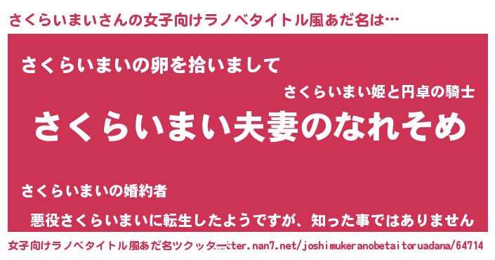 | 男性向けラノベタイトル風あだ名 | 『おまえをオタクにしてやるから、俺をさくらいまいにしてくれ! 』 |
