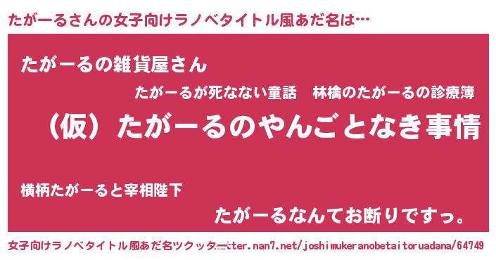 | 胡散臭い通販商品みたいなあだ名 | 『必ず成功するブレスレット…その名も「たがーる」』 |
