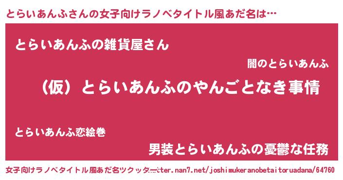 | 男性向けラノベタイトル風あだ名 | 『とらいあんふの憂鬱』 |