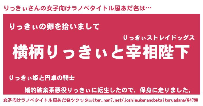 | 男性向けラノベタイトル風あだ名 | 『りっきぃに滅ぼされるだけの簡単なお仕事です』 |