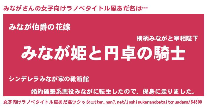| 男性向けラノベタイトル風あだ名 | 『みながの憂鬱』『ミナガスレイヤー』 |